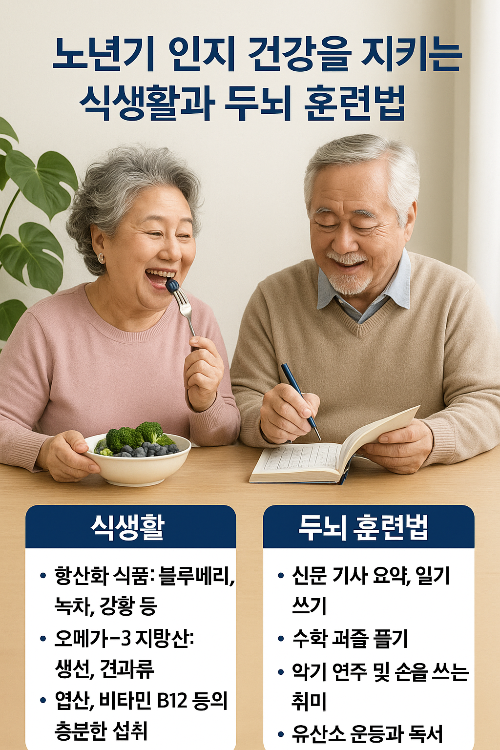 노년기에 접어들면서 많은 이들이 겪는 인지기능 저하는 단순한 노화 현상이 아니라, 식생활과 생활습관, 정신적 자극의 수준과 밀접한 관련이 있습니다. 이 글에서는 뇌 건강에 도움이 되는 식단 구성 원칙과 과학적으로 검증된 두뇌 훈련법을 결합하여, 노년기 인지기능을 유지하고 향상하기 위한 실천 전략을 제시합니다. 치매 예방부터 일상 속 기억력 향상, 집중력 개선을 위한 접근까지 포괄적으로 다루며, 현실적인 실천 방법과 구체적인 음식 목록, 두뇌 훈련 루틴 등을 전문가 관점에서 설명합니다.