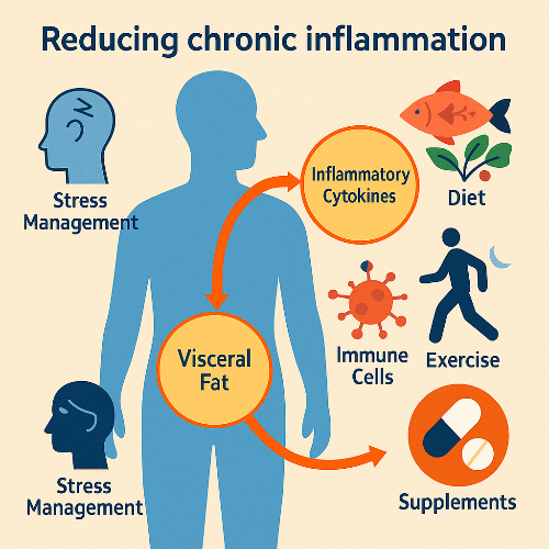 심리적 스트레스는 만성염증을 유발하는 HPA 축 과활성화의 직접적 원인입니다. 명상, 호흡 훈련, 자연 노출, 일지 작성 등의 스트레스 해소법이 효과적입니다.