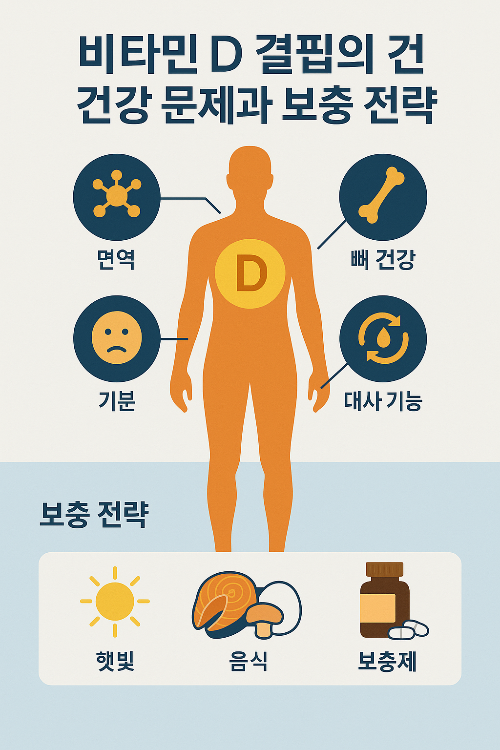 현대인의 생활 방식은 구조적으로 비타민D 결핍을 유발할 수밖에 없습니다. 실내 중심의 활동, 자외선 차단제 사용, 불균형한 식단은 비타민D의 생리적 합성과 흡수를 모두 방해하며, 이에 따라 결핍은 더 이상 특정 집단만의 문제가 아닌 전 인구적 건강 위협 요소가 되었습니다. 비타민D는 단순한 보조제가 아닌, 신체 항상성과 면역 방어체계를 유지하는 데 반드시 필요한 호르몬 유사물질입니다. 또한 암, 우울증, 자가면역질환 등의 예방과 치료에도 긍정적인 연관성이 보고되고 있으며, 보충 전략의 정교화가 중요해지고 있습니다. 자신의 생활환경과 건강 상태를 고려한 맞춤형 비타민D 관리 전략은 건강한 노화와 질병 예방의 핵심 열쇠가 될 수 있습니다. 하루 5분의 햇빛, 매일의 식사 선택, 한 알의 보충제가 건강을 근본적으로 바꿔놓을 수 있습니다. 이 글이 여러분의 건강 루틴을 점검하고, 비타민D를 일상 속에 전략적으로 배치하는 데 도움이 되길 바랍니다.
