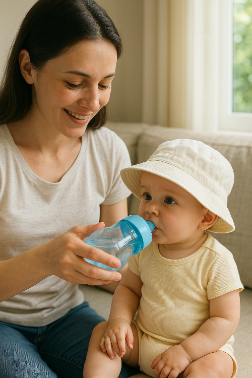 - 분유, 모유 외에도 생후 6개월 이상 유아는 물 섭취를 권장하며, 활동량이 많거나 땀을 많이 흘릴 경우 소량씩 자주 수분을 보충합니다.