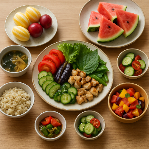 체질에 따라 약간의 변형도 필요합니다. 열이 많은 사람은 수박, 오이, 참외처럼 찬 성질의 식품을 중심으로 구성하고, 평소 소화기 기능이 약한 사람은 가지나 고추 대신 익힌 애호박, 감자 등을 활용하는 것이 좋습니다. 또한, 더위로 인해 식욕이 없을 때는 자극적인 반찬보다는 식감을 살려주는 다양한 채소나 과일을 믹스한 샐러드, 죽, 쌈밥이 효과적입니다.
